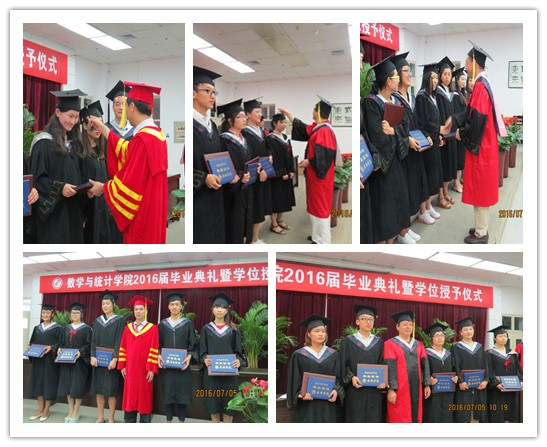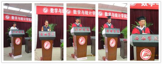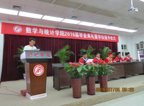 2016年7月5日上午,在学校图书馆六楼报告厅隆重举行了数统学院2016届毕业典礼暨学位授予仪式。参加此次仪式的有校长陈刚、数统学院院长赵临龙、院党总支书记郭全寿、副院长汪义瑞、副院长王昭海、统计系系主任杜贵春、数学系系主任成波、系工会主席魏春强、院办公室主任何晓燕、学工办主任马新华以及教师代表黄兆霞、师帅和2016届全体毕业生共200余人参加了活动。仪式由院党总支书记郭全寿主持。