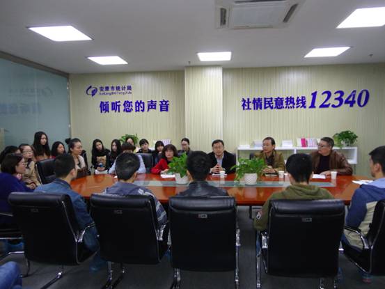 2016年11月2日,2017届统计学专业实习见面会在安康市统计局社情民意调查中心召开。安康市统计局总统计师陶勇俊、社情民意调查中心王主任、汉滨区统计局邢科长,以及数学与统计学院副院长汪义瑞、统计系主任杜贵春、辅导员师帅、教师徐龙华,31名专业见习学生参加了此次活动。