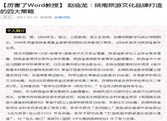 2017年3月21日,安康学院微信发布《赵临龙:陕南旅游文化品牌打造的四大策略》文章,,这是继《中国科技新闻网》(http://www.zgkjxww.com/whys/1482808090.html)刊发《赵临龙:慧眼识珠,致力打造陕南旅游文化品牌》(2016-12-27 11:06),又一次刊发赵临龙教授关于陕南旅游文化品牌打造的思考文章,标志“陕南旅游文化品牌打造的策略”引起媒体注意。