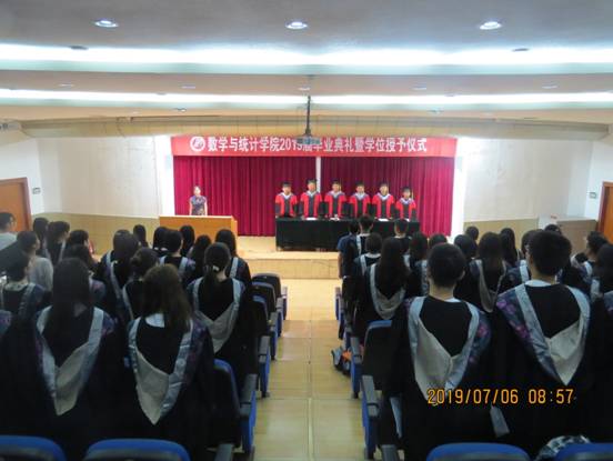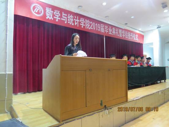 副院长成波宣读《安康学院2019届毕业生授予学士学位的决定》及数统学院2019届毕业生授予学士学位人员名单,并向获得学士学位的135位毕业生表示祝贺。副院长王昭海宣读《安康学院对于2019届优秀毕业生的表彰决定》和校友联络员名单,肯定了20名优秀毕业生们四年来的辛苦付出和取得的骄人成绩,并对毕业生校友联络员表示感谢。