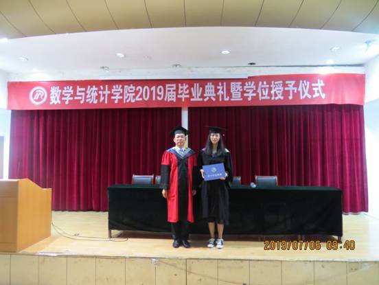在全场热烈的掌声和欢快的音乐声中,数统学院院长汪义瑞为获得学士学位的毕业生逐一拨穗,颁发学士学位证书。