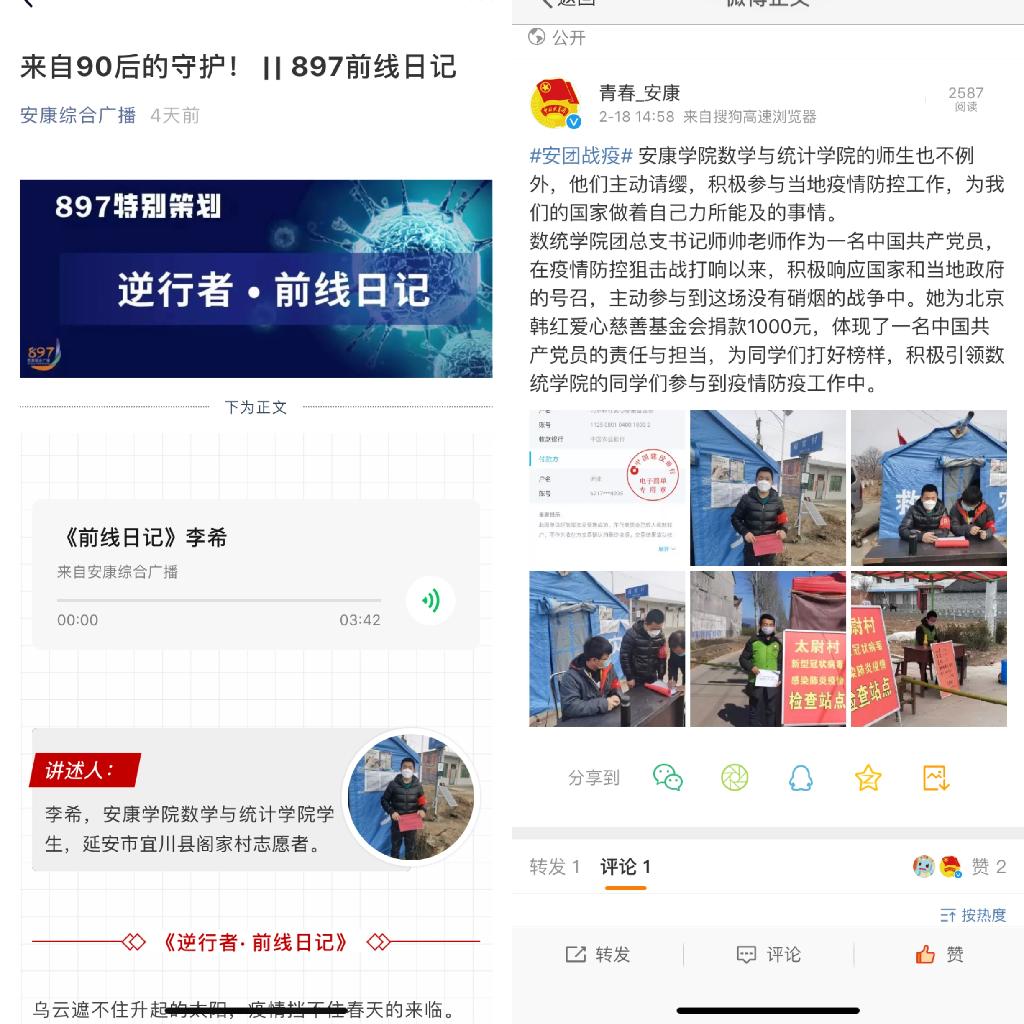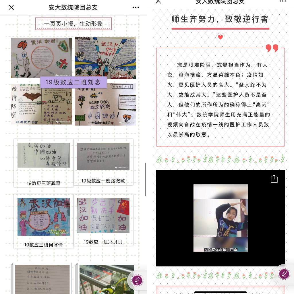 通过“防疫要知道”分享疫情防控措施,提升学生思想认识;通过“抗疫,数统在行动”优秀志愿者事迹介绍,强化学生责任感和凝聚力;通过“数统学子有话说”视频录制,组织引导学生,特别是学生党员分享交流;通过“辅导员微课堂”,鼓励学生宅家不停学,养成自律好习惯;通过“爱的零距离—为武汉加油”“师生齐努力,致敬逆行者”引导低年级学生开展了绘画、歌唱等形式多样的文化活动,丰富学生寒假生活,帮助学生树立信心,科学防疫。同时,学院战疫宣传稿件被安康广播台微信公众号(安康综合广播)和共青团安康市委微博账号(@青春-安康)转载。此外,辅导员通过线上微信群、QQ群等线上平台,积极宣传防疫知识,为学生送上温馨提示,对学生进行心理疏导。