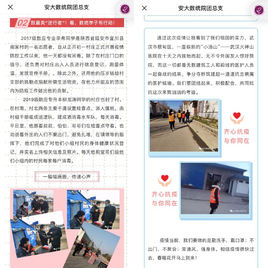 在党、团总支号召中,数统学院也涌现了一批敢担当、勇作为的师生典型。团总支书记师帅老师向北京韩红爱心慈善基金会捐款1000元,2019级学生党员柳龙涛、2017级入党积极分子李希、2019级学生张思甜、黄海莹等一批青年志愿者都主动参与到所在乡镇、村庄的疫情防控工作当中,体现了数统学子的责任与担当。