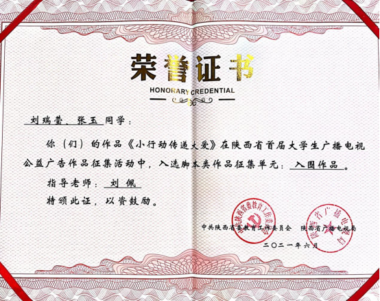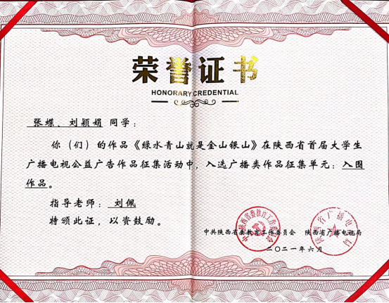 该项活动由中共陕西省文明办指导,中共陕西省委教育工作委员会和陕西省广播电视局联合主办,陕西省广播电视对外交流中心、彬州梦想流坊文化传播有限公司承办,以“四史”学习、全面建成小康社会、脱贫攻坚、新冠疫情防控、聚焦“十四运”等为主题。活动自发布以来,在陕西省内共收集了30个高校的500余件作品,其中我院学生张蝶、刘颖娟创作的广播作品《绿水青山就是金山银山》,刘瑞莹、张玉创作的脚本作品《小行动传递大爱》均入围优秀作品,指导教师刘佩被评为“优秀指导老师”。