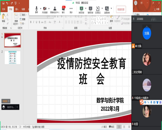 为积极响应省、市疫情防控工作最新通知要求和学校最新疫情防控工作安排,2022年3月27日-28日,数统学院辅导员董婷瑜、刘佩和马勇分批次分班级通过线上、线下结合的方式为全院学生召开了疫情防控暨安全教育主题班会。