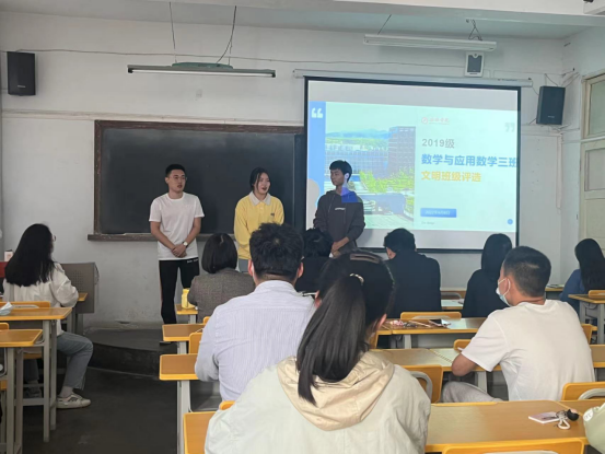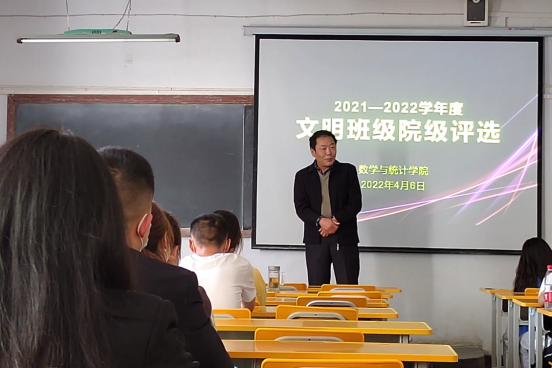 为进一步加强校园文化建设,营造团结向上的班级文化氛围,促进班级管理,增强学生的集体荣誉感和归属感,4月6日下午两点半,数学与统计学院在2203教室开展了文明班级院级评选,2019级、2020级八个班级参加了评选,党总支书记郭全寿、辅导员董婷瑜、刘佩、马勇担任评委,评选会由董婷瑜主持。