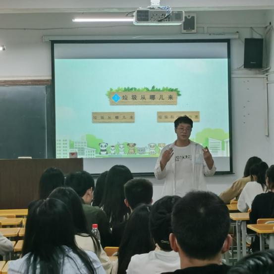 马勇首先从我国目前的垃圾现状入手,让同学们了解到垃圾处理面对的严峻形势,让同学们明白垃圾分类投放的宣传已迫在眉睫。分别从垃圾从哪儿来、怎样减少垃圾、垃圾怎么分类以及垃圾去哪儿了四部分为同学们进行了深入的讲解。通过通俗易懂的讲解,同学们了解到生活垃圾的主要来源、生活垃圾对大气、水体、土壤及各种生物的危害;同学们也深刻认识到通过光盘行动、低碳旅行、低碳购物等生活方式可以有效减少垃圾产生量;此外,同学们掌握了生活垃圾可分为可回收物、有害垃圾、厨余垃圾和其他垃圾四类,能够将校园内常见垃圾准确地进行分类;最后,同学们掌握了垃圾的处理方式,即回收处理、焚烧处理、卫生填埋和生物处理四种方式。