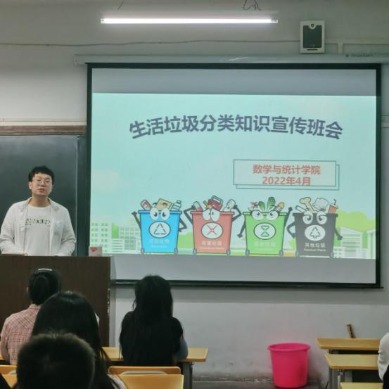 为了营造良好的校园环境,加强同学们垃圾分类回收意识,让垃圾分类理念深入人心,引导全校师生正确投放垃圾,促进学校切实有效做好垃圾分类工作,2022年4月27日,数学与统计学院垃圾分类指导员马勇组织召开生活垃圾分类知识宣传班会,参会人员为垃圾分类引导员和志愿者、本届入党积极分子、各班班委及各宿舍舍长。