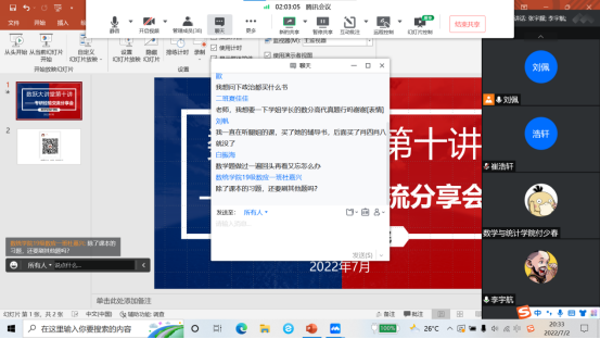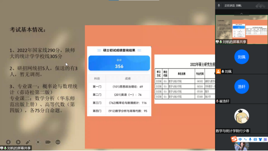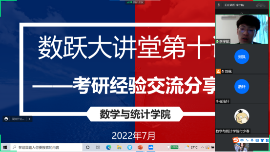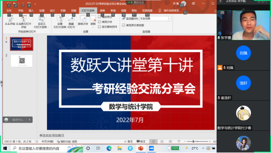 为加强学生对考研知识和经验的了解,营造积极向上的学风,2022年7月2日晚上,数学与统计学院举办了线上考研经验交流分享会,2019级有考研意愿的40余名学生参加了本次会议,分享会由2022年考研录取的李宇航等四名学生主讲,团总支书记刘佩主持。