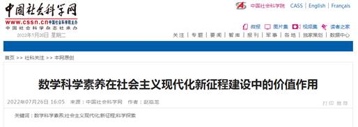 2022年07月26日 ,中国社会科学网“本网原创”栏目,发表安康学院数学与统计学院二级教授赵临龙的文章《数学科学素养在社会主义现代化新征程建设中的价值作用》。