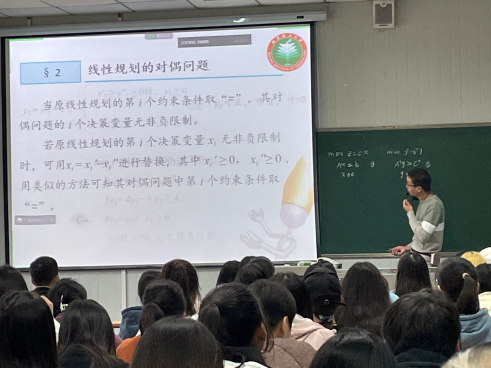 为了提高课程教学质量,积极推进数学与应用数学专业课程建设,数统学院教师李更生在江南1036教室做了《运筹学》课程中“线性规划的对偶问题”教学,数统学院副院长成波、徐龙华、校教学督导赵临龙、工会主席魏春强、统计系系主任杜贵春、数学系系主任王芮婕、系教学督导王秋芬、大学数学教学部教师齐丽英等进行了观摩。