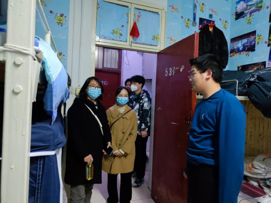 为进一步了解学生在校安全以及身心健康状况,了解学生所需所求,2022年11月27、28日,数统学院党总支书记郭全寿、辅导员董婷瑜、刘佩和马勇老师一同前往学生宿舍看望学生。