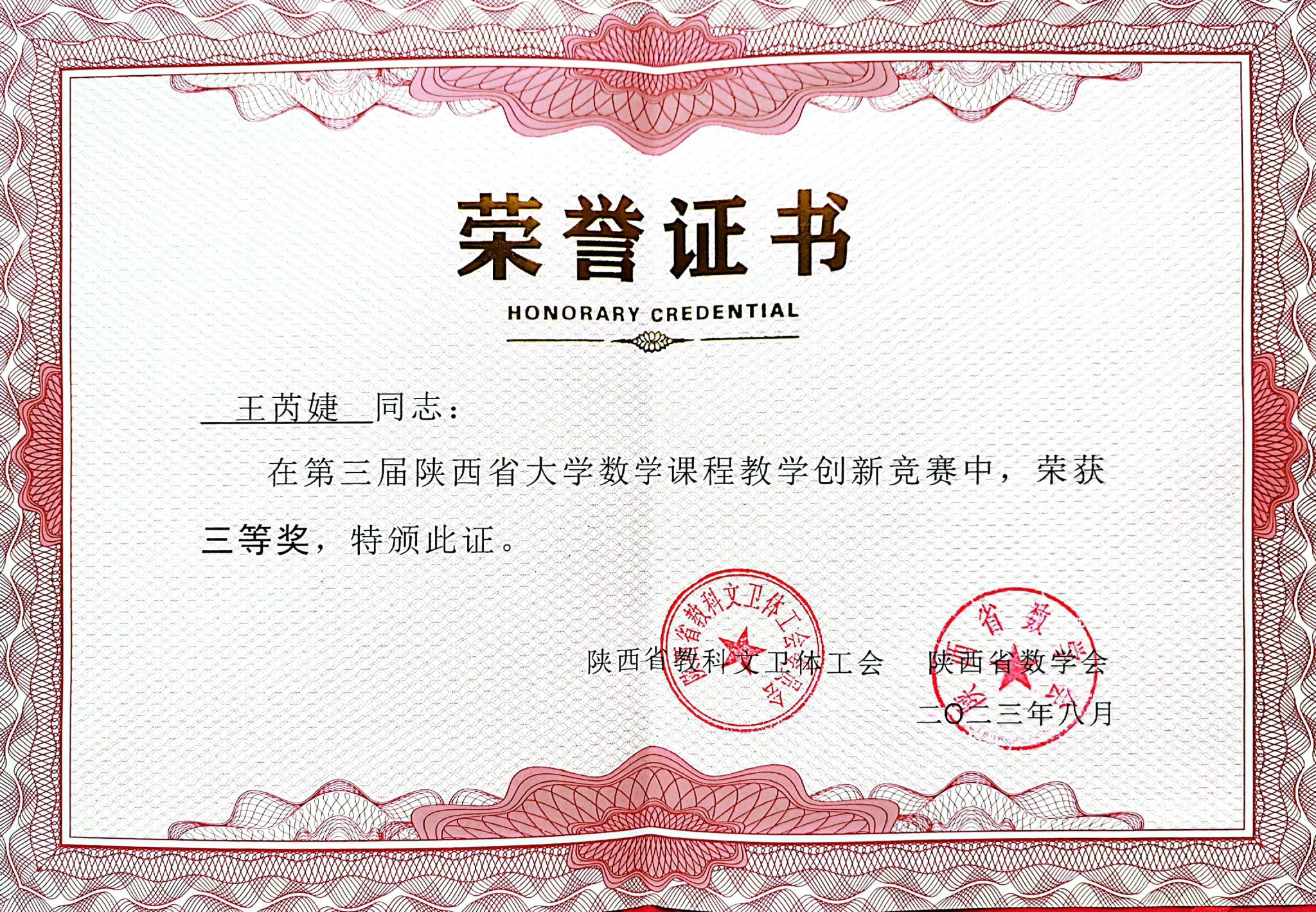 我院教师王芮婕主讲的《数学分析》课程在由陕西省数学会、陕西省教科文卫体工会委员会联合举办的第三届陕西省大学数学课程教学创新示范交流活动中荣获省三等奖。