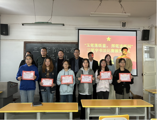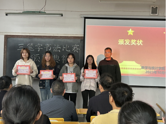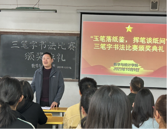 为进一步提高学生们的综合素质,强化师范技能,增强实践演练能力,丰富课余生活,2023年9月18日至20日,数学与统计学院成功举办了师范生“三笔字”书法比赛。10月9日,举行了本次“三笔字”书法比赛颁奖典礼,数统学院党总支书记郭全寿,院长成波,副院长徐龙华,副院长杨高翔,辅导员董婷瑜、刘佩和马勇,以及部分学生参加了本次颁奖典礼。