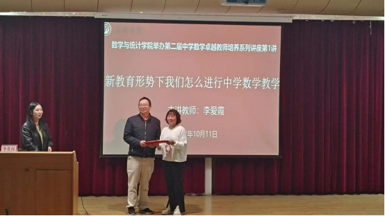 此次讲座对我院数学与应用数学专业学生树立师范生的专业素养、提高中学数学教学能力提升等方面具有重要指导意义,并为以后走向教师岗位成为一名优秀教师奠基了良好的基础。讲座最后,魏春强为李爱霞颁发聘书,并合影留念。