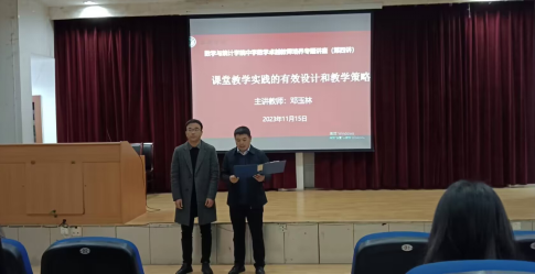 为进一步培养我院师范生成为一名合格教师,深化教育改革,加强教师队伍建设,2023年11月15日晚,数学与统计学院于江南校区1号教学楼报告厅开展第二届中学数学卓越教师培养专题讲座第四讲。此次讲座以“课堂教学实践的有效设计和教学策略”为主题,培训由陕西省学科带头人培养对象、省教学能手邓玉林老师主讲。讲座由教学院长徐龙华主持。