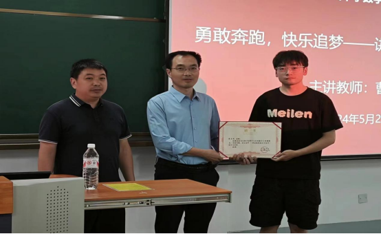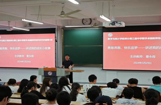 2024年5月29日,数学与统计学院于江南校区1510教室举办了第三届中学数学卓越教师培养专题讲座第四讲。特邀请陕西省学科带头人、陕西省教学能手、安康市学科带头人、安康市名师大篷车讲师团成员、安康市共青团讲师、安康市“三区”人才支持计划骨干团队成员、安康市教体系统优秀党员、安康市初中数学课堂教学改革先进个人、安康市初中数学观摩研讨会说课一等奖、讲课一等奖获得者、安康市初级中学教师曹永程为中学数学卓越教师培养班学生带来以《勇敢奔跑,快乐追梦——讲述我的成长小故事》为题的报告,数学与统计学院副院长徐龙华出席并主持此次讲座,鲁星星老师为曹永程老师颁发聘书。