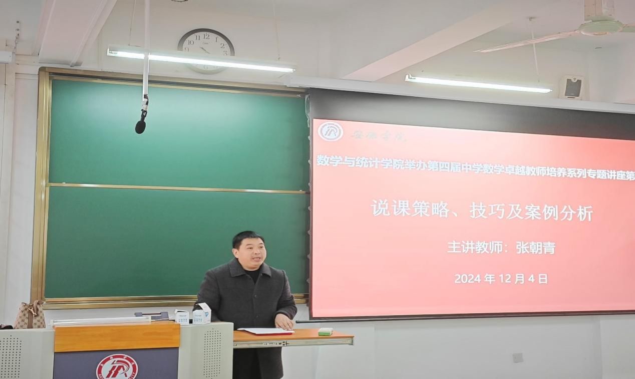 2024年12月4日,数学与统计学院在江南校区1510教室隆重举办了第四届中学数学卓越教师培养系列专题讲座第一讲。本次讲座以“说课策略、技巧及案例分析”为主题,由汉滨初级中学正高级教师、陕西省特级教师、省校本教研先进个人、陕西省首批中小学教学名师张朝青担任主讲人。第四届中学数学卓越教师培养班全体学生参加了本次讲座,数学与统计学院副院长徐龙华、卓越教师培养班班主任鲁星星出席此次讲座,讲座由鲁星星主持。