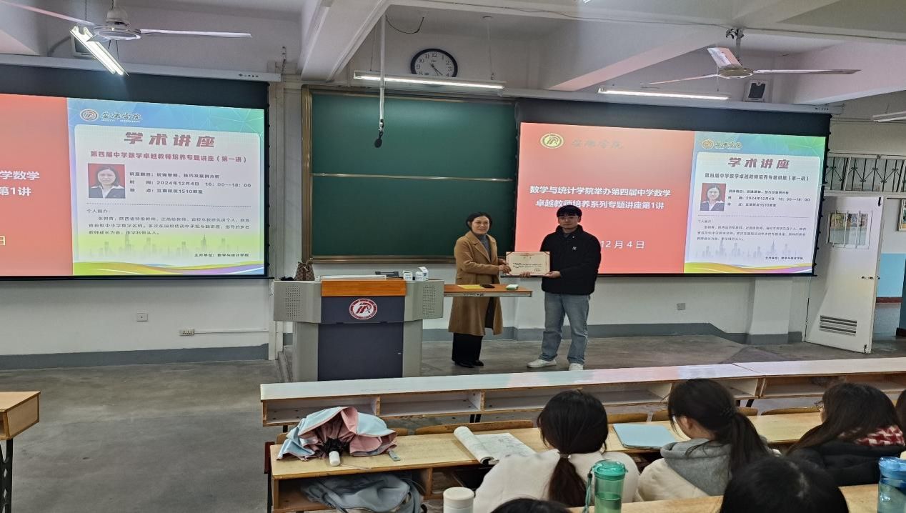 此次讲座是数学与统计学院第四届中学教学卓越教师培养系列专题讲座的开篇之作,为后续讲座的举办奠定了坚实的基础。学院将继续秉承“以学为中心,以教促发展”的理念,为中学数学卓越教师培养班学生提供更多优质的教学资源和培训机会,助力教育事业的发展。讲座最后,鲁星星为张朝青颁发聘书,并合影留念。
