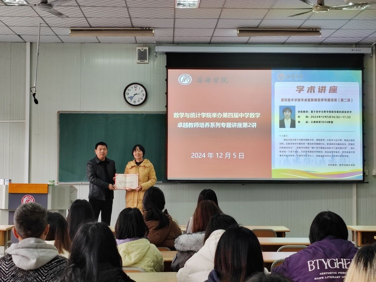 2024年12月5日数学与统计学院举办第四届中学数学卓越教师培养系列专题讲座第二讲。特邀请安康市高新中学高级教师、中级学习治疗师、高级心理咨询师、县级优秀教师、陕西省教学能手、陕西省数学竞赛优秀指导老师杨桂花为卓越教师班同学做了题为《基于初中生数学思维发展的课堂教学》的专题讲座。数学与统计学院副院长徐龙华主持本次会议,并为杨桂花颁发聘书。