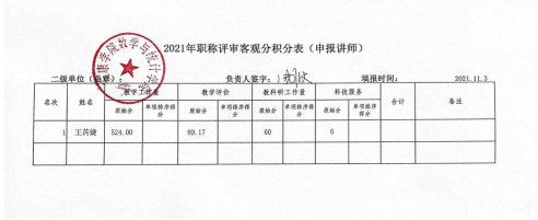 现将数统学院2021年讲师职称评审客观分积分表予以公示,公示期3天(2021年12月15日-18日),公示期间如有异议,请向数统学院专业技术职务评审工作组反应。