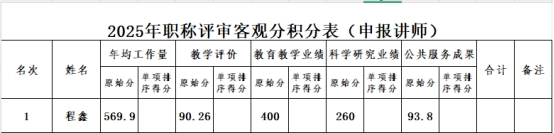根据《安康学院专业技术职务评审工作实施办法(修订)》(校党发(2024)57号)及《数学与统计学院讲师任职资格评审实施细则(修订)》,经个人申报,数学与统计学院专业技术职务评审工作组资格审核,现将符合2025年度讲师职称申报要求的教师客观分积分和申报材料予以公示。公示期3天(2025年10月29日-10月31日),公示期间如有异议,请向数统学院专业技术职务评审工作组反应。